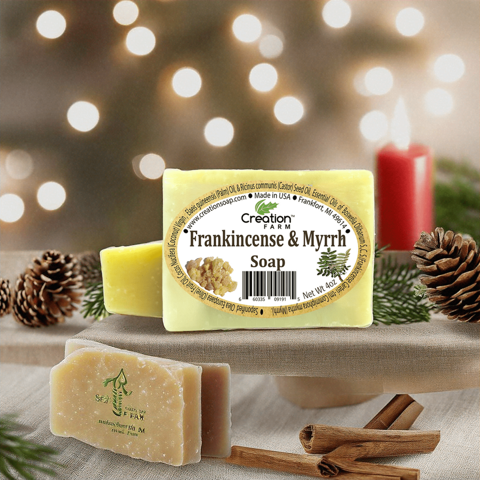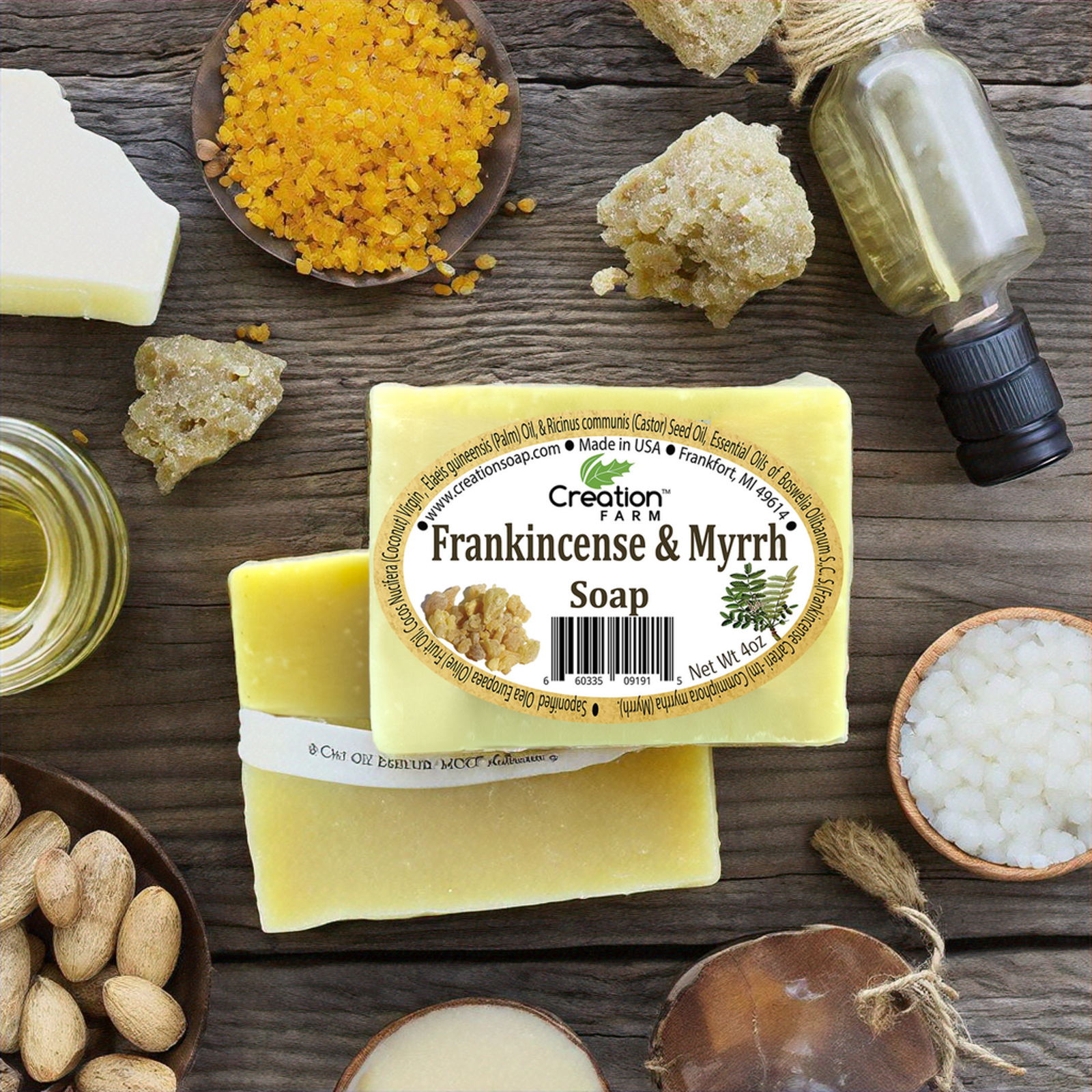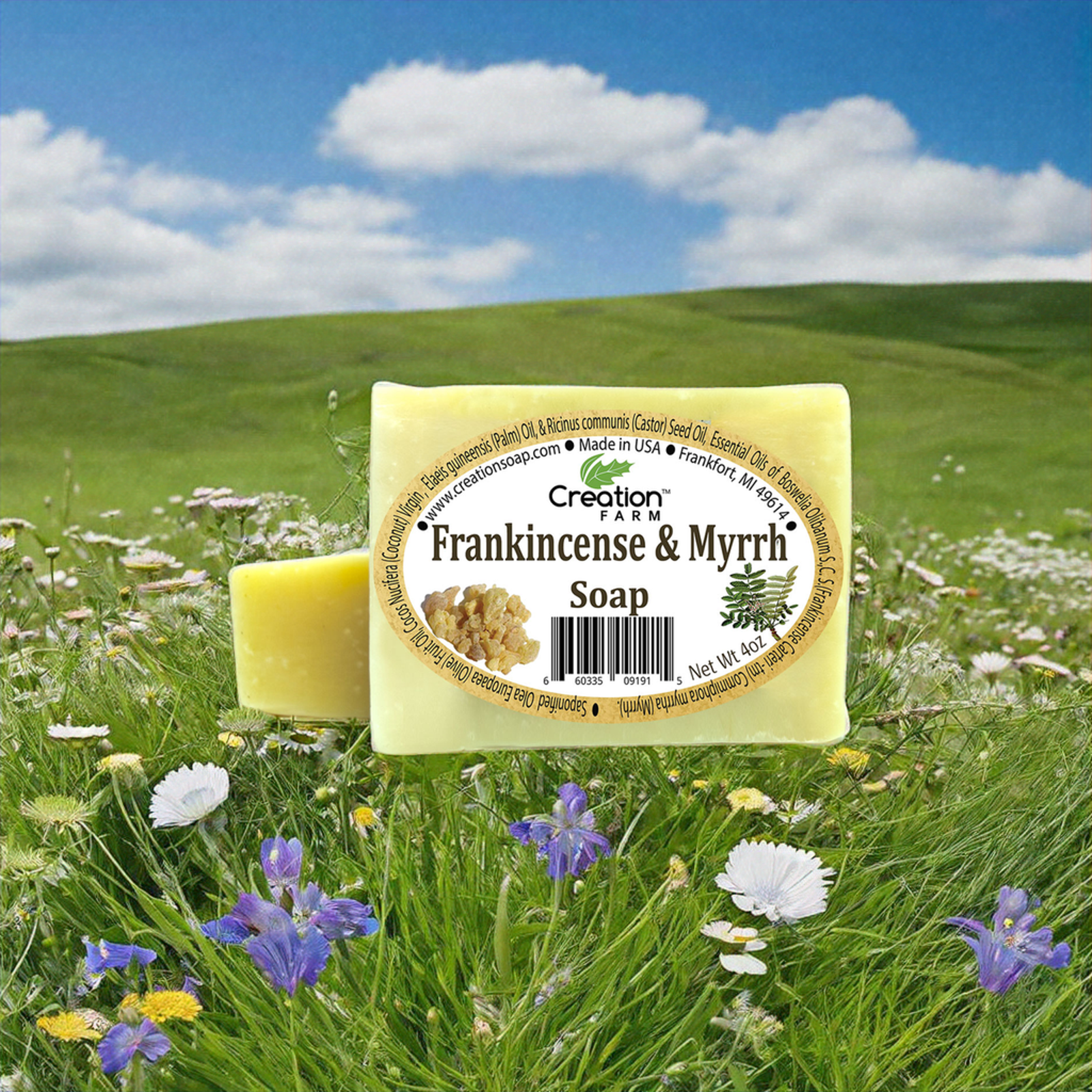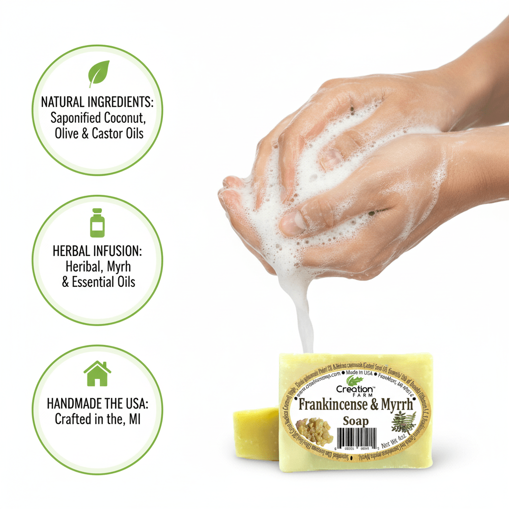 Experience the timeless allure of Creation Farm Frankincense & Myrrh Soap, a handmade artisan bar crafted for daily indulgence and thoughtful gifting. Scented with authentic frankincense essential oil and myrrh resin, it offers a warm, centering aroma that resonates with tradition.