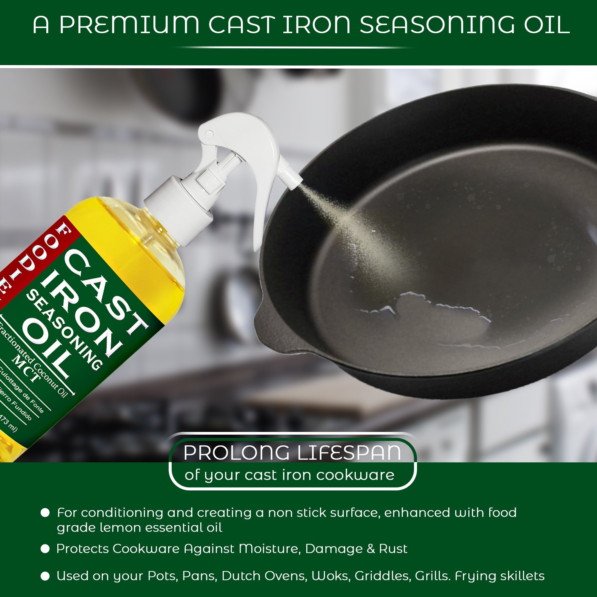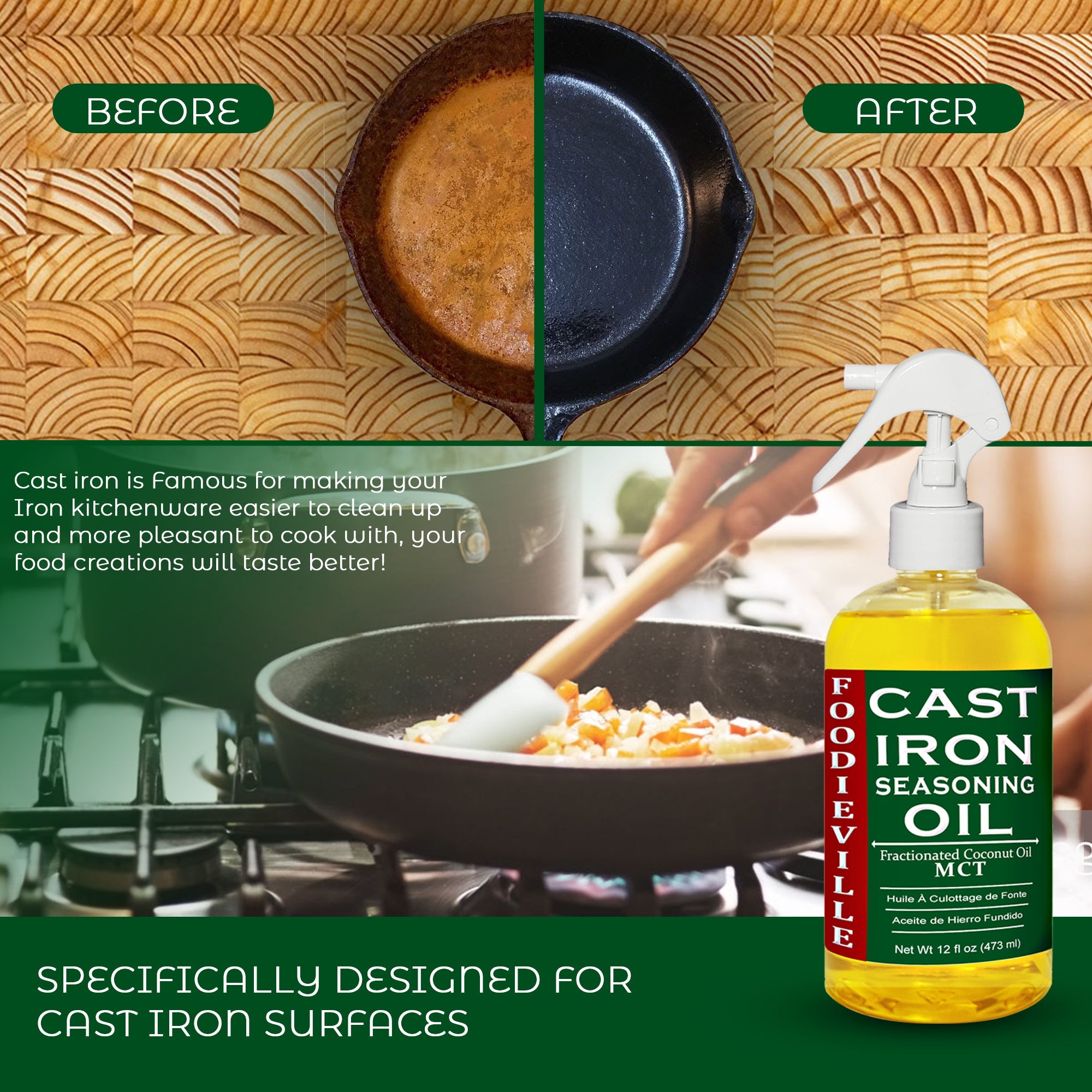 - Optimized blend of flax, sesame, and coconut MCT oils for seasoning and protection